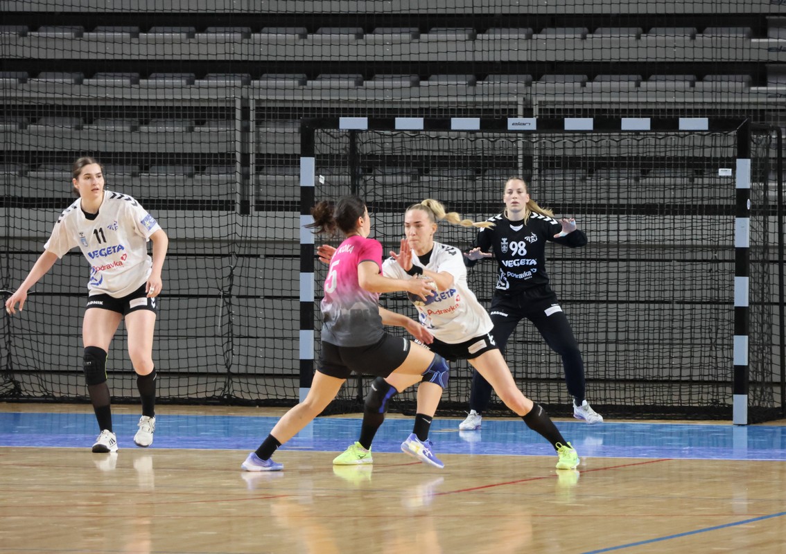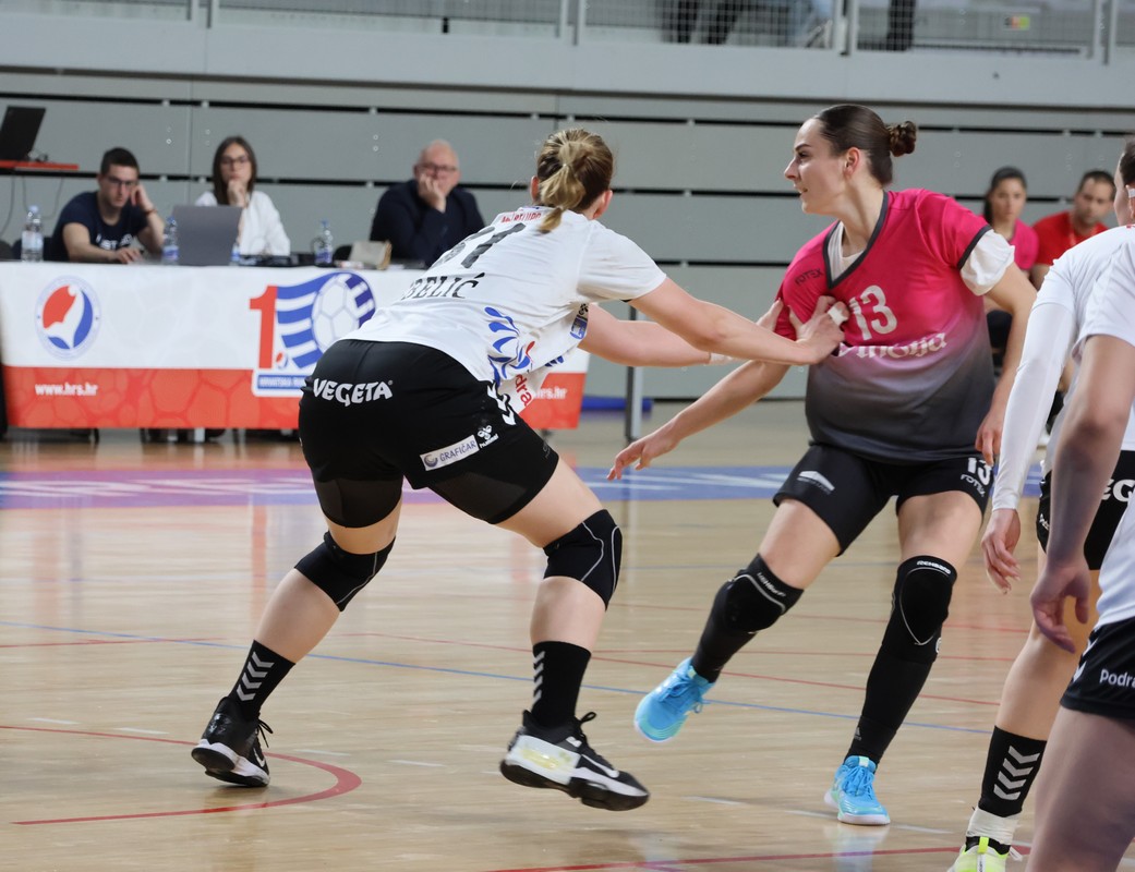 Na početku susreta, domaća ekipa ima dva minimalna vodstva, no ubrzo nakon toga Ana Debelić i Katarina Pandža postižu pogotke iz kontri te je rezultat u sedmoj minuti 2:4. Još samo jednom približila se varaždinska ekipa i to u 13. minuti kada dolazi na pogodak zaostatka (rezultat 6:7). Odmah nakon toga, čvrstom obranom domaća ekipa ostaje bez rješenja u napadu pa pogodak ne postiže punih 10 minuta. Sjajan posao odrađivale su Katarina Pandža, Sara Šenvald, Tina Barišić, Kristina Dramac te već spomenuta Ana Debelić. S krila prijete Andrea Šimara i Nikolina Krauglj te se vodstvo u 23. minuti penje na 11 pogodaka (rezultat 6:17). Do kraja prvog dijela, tri pogotka domaće ekipe i dva Podravka Vegete te se na predah odlazi s 9:19. Odlično prvo poluvrijeme na vratima je imala Antonia Tucaković koja je upisala šest obrana, od čega dva sedmerca.
