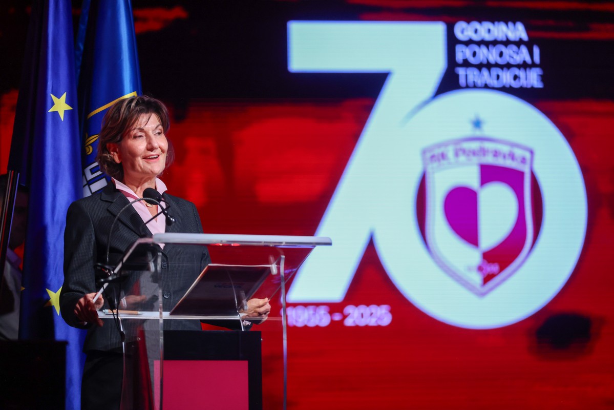 – Čestitke svim bivšim i sadašnjim igračicama, kao i svim djelatnicima, na velikoj 70 obljetnici. Izvanredno je to dugo vrijeme. 70 godina raditi i razvijati na jednoj visokoj razini uspješnosti je veliki uspjeh svih koji su to radili i koji to rade danas. Sigurna sam da će se ovakva uspješna putanja Kluba nastaviti i u godinama koje dolaze. Proslava je ovo zajedništva Rukometnog kluba Podravka, Grada Koprivnice i kompanije Podravka. Naša kompanija stajala je uvijek uz Klub, u pobjedama, u porazima i možda ne tako uspješnim trenucima. Podravka je uvijek bila uz rukometni klub i to će tako sigurno i dalje biti. U Europi ne postoji primjer ovako dugotrajne i kontinuirane suradnje između tvrtke i nekog sportskog kluba uz koju ta tvrtka stoji. Također, to izaziva jedan osjećaj osobnog ponosa što imam priliku stajati na čelu kompanije koja je ovako uporno i dosljedno, prepoznala i podržavala sportski projekt. Mijenjali su se direktori, predsjednici uprava, društveni sustavi, ali podrška Podravke je uvijek bila tu. Jedan bih razlog htjela istaknuti. Ono čime se bavi rukometni klub i kompanija Podravka, je isti posao – natjecanje. Rukometni klub na utakmicama, dok se i kod tvrtke radi o jednom natjecanju na tržištu, natjecanju s našim konkurentima širom svijeta. Na kraju, želim puno uspjeha u godinama koje dolaze. Sigurna sam da će i buduće generacije rukometašica koje dolaze, donijeti puno radosti, osobito jer rukometni klub na tome radi svakodnevno i u Školi rukometa na način da sve djevojčice iz Hrvatske žele biti dio te rukometne škole. Naravno, želim da i trener Obrvan i sadašnja generacija igračica donesu još jednu zvjezdicu na dres Kluba – poručila je u govoru Martina Dalić, nakon koje se svima obratio predsjednik Hrvatskog rukometnog saveza Tomislav Grahovac.